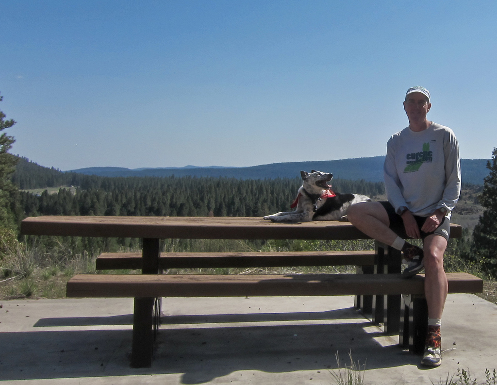 His last week and a half was his living hell; but the previous eight years were wonderful. When Margo & I rescued him he was a two year old “cowardly cowdog,” fired from three ranches in Lake County, Oregon for being afraid of cows, and being too friendly to be a watchdog – but he found his confidence as my trail buddy. We put in well over a thousand trail miles per year – running, cross country skiing, hiking, and mountain biking; not to mention going everywhere in the truck with me, coming to work with me at KFPC, and even coming with me when I took out the garbage. We are happy for you – your suffering is over – you are fine now. Margo and I will miss you for the rest of our lives. Rest in Peace, Ringo Dingo.